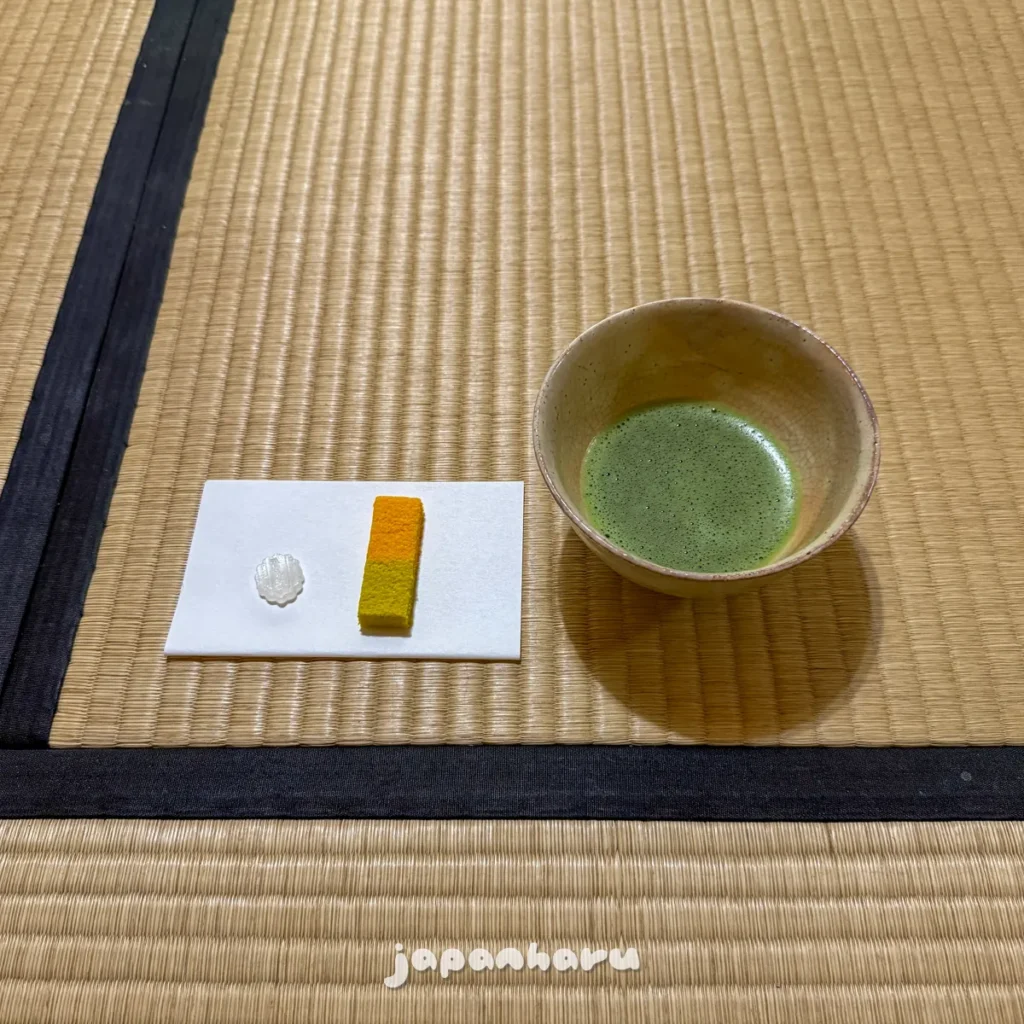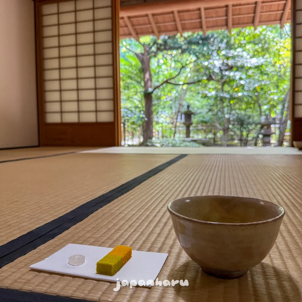 다다미방에서 밖을 바라보며 마시는 말차 한 잔