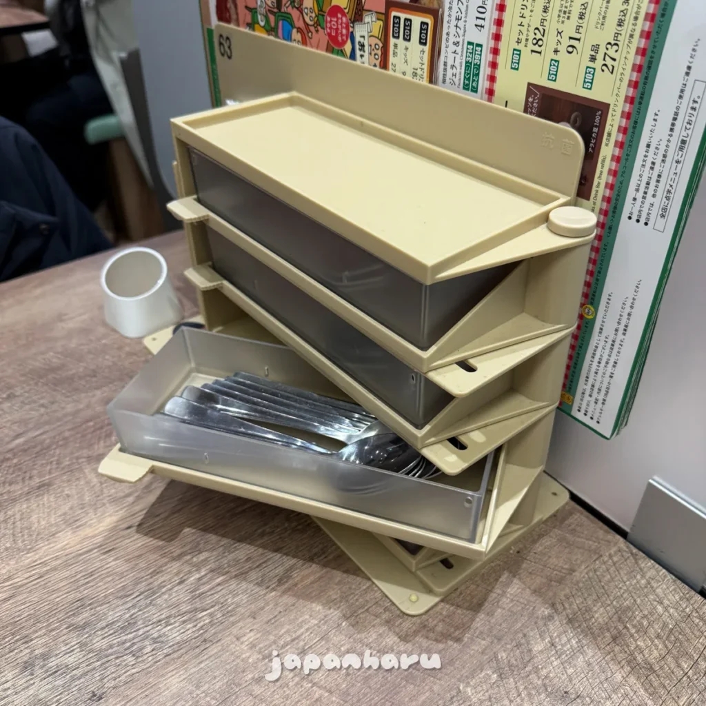 사이제리야는 이렇게 수저를 셀프로 꺼낼 수 있게 수저통이 테이블에 놓여져 있어요.
