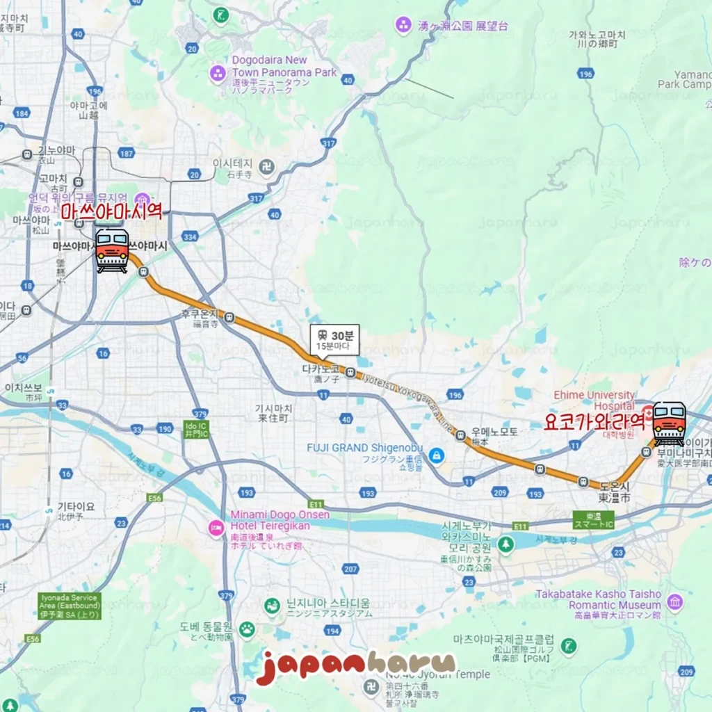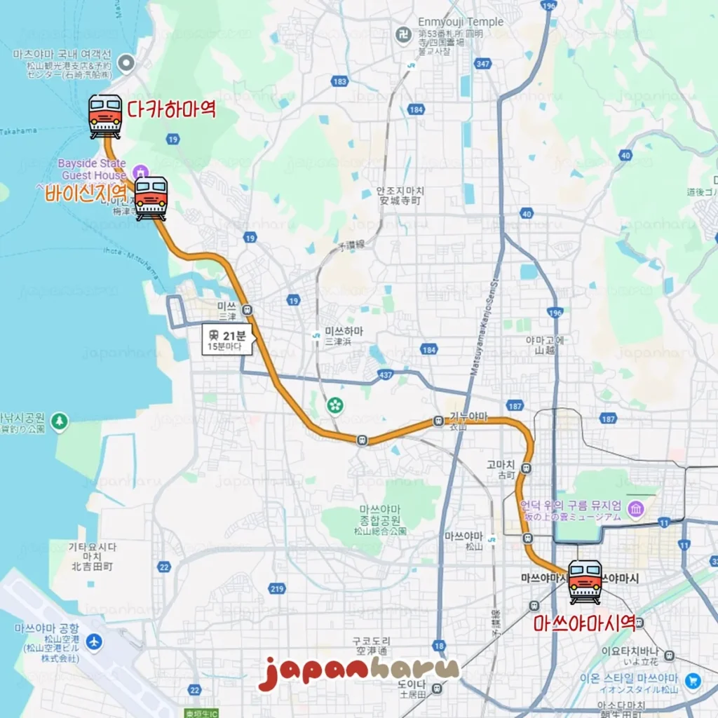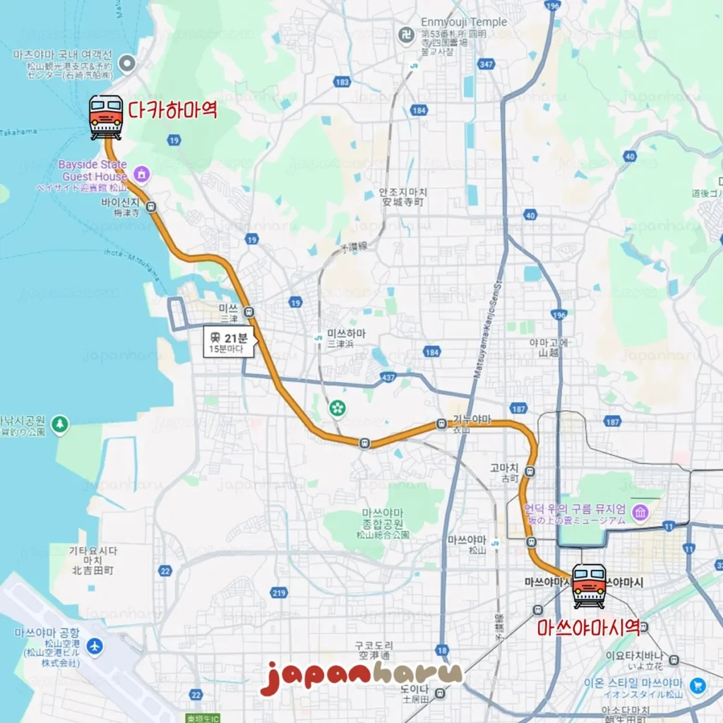 | 마쓰야마시역~다카하마역 | 다카하마선 | 490엔 | 21분 |