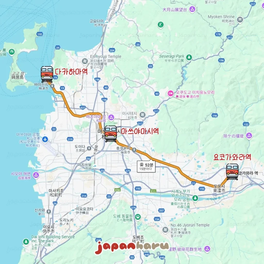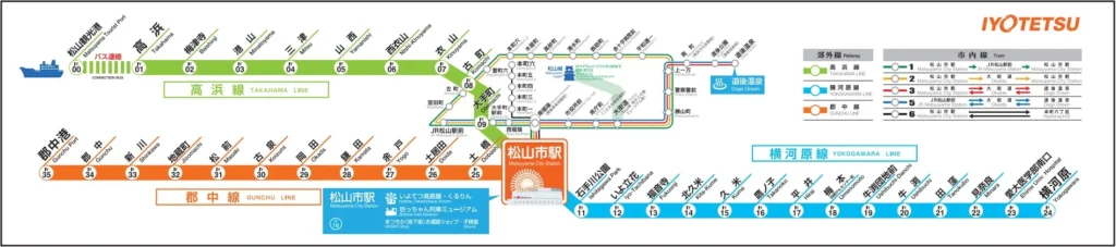 마쓰야마시역~다카하마역을 잇는 다카하마선과 마쓰야마시역~요코가와라역을 잇는 요코가와라선은 서로 직결운행이라고 해서 서로의 노선까지 함께 운행하는 형태에요.