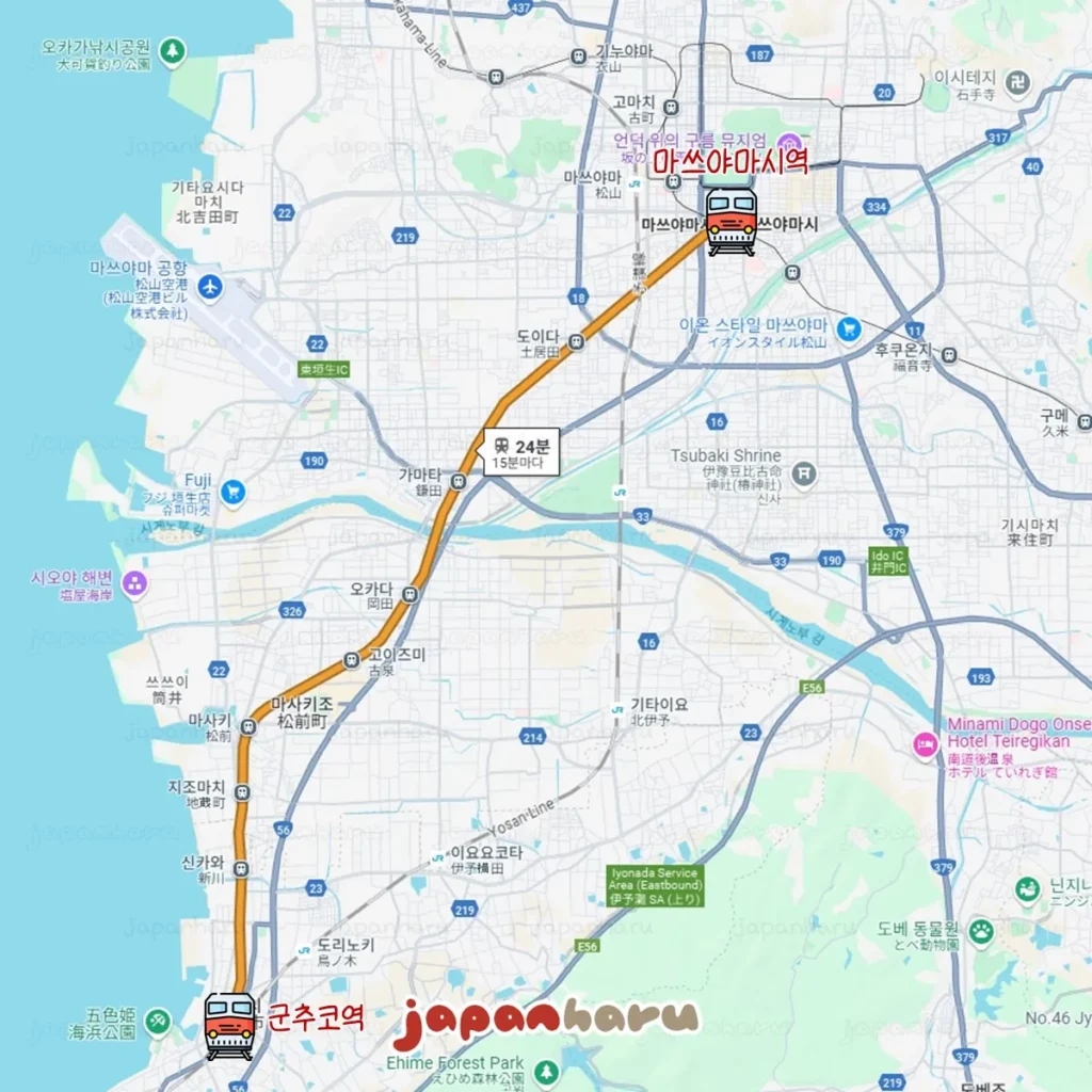 | 마쓰야마시역~군추코역 | 군추선 | 550엔 | 24분 |