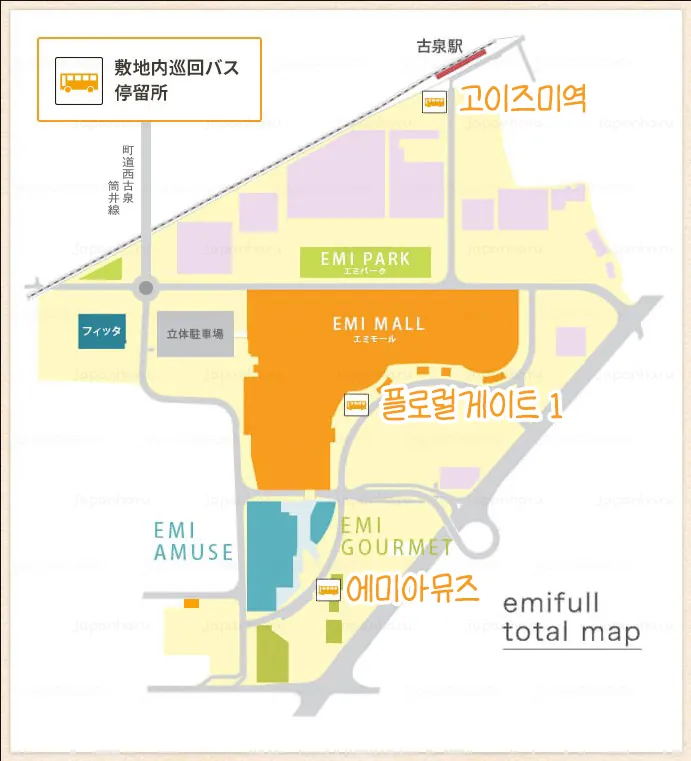 고이즈미역에서 에미풀 마사키까지는 5분 정도 걸어서 갈 수 있지만 무료 셔틀버스도 있어요!